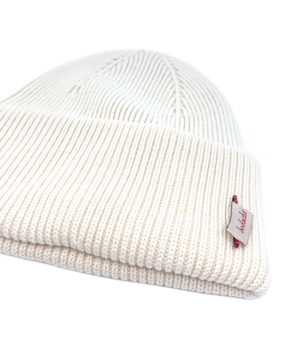 Gebreide beanie van Bedacht, ontworpen in Duitsland en geproduceerd in Italië.