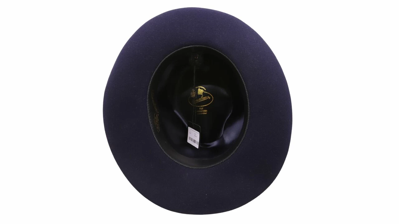 De hoed heeft een gesneden rand, een zacht lederenband aan de binnenkant van de hoed, zijde voering en zijde lint.