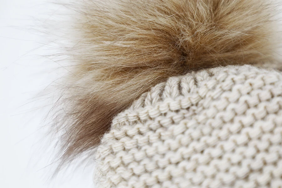 De muts is gemaakt van 80% polyacryl en 20% wol met een imitatie bont (fake fur) pom pom.Gevoerd met fleece, dit zorgt ervoor dat de wind er bijna niet door heen gaat en uw hoofd en oren goed beschermd.