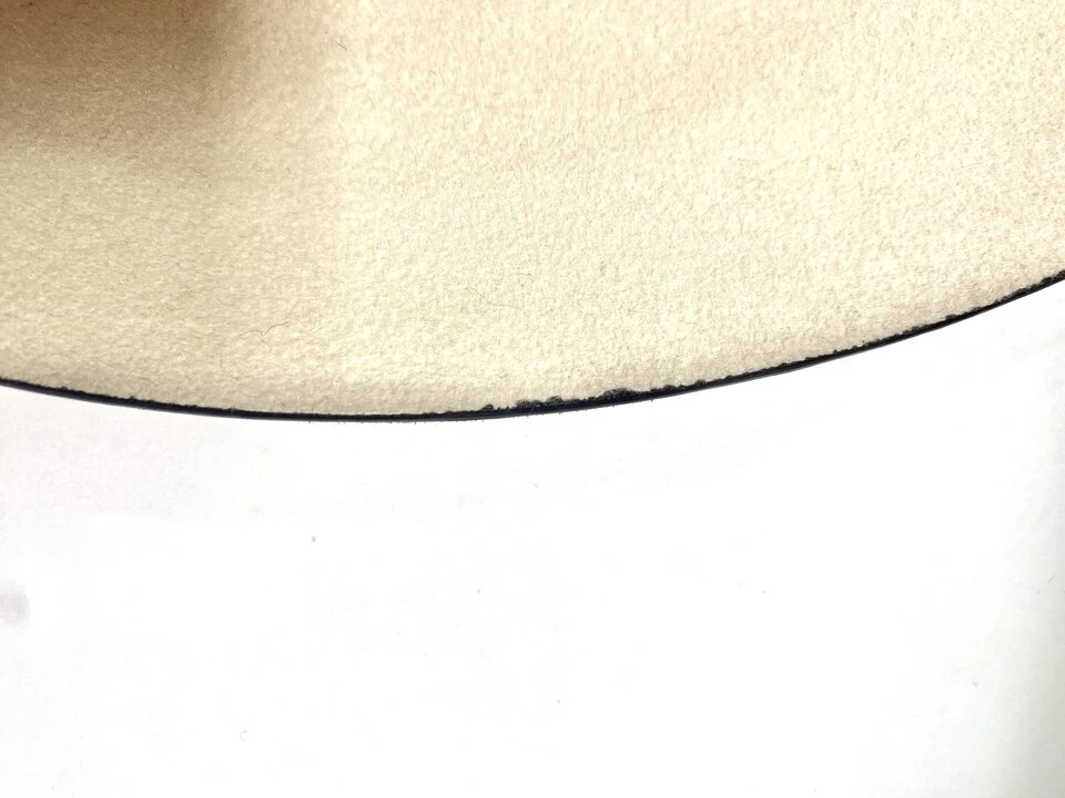 De rand van de hoed is met een laser gesneden en vervolgens met een speciale verf afgewerkt, deze kleur komt terug in afwerking van het lint. Helaas is de verf uitgelopen in het proces en hierdoor niet naar onze standaard, daarom is deze collectie afgeprijsd.Â