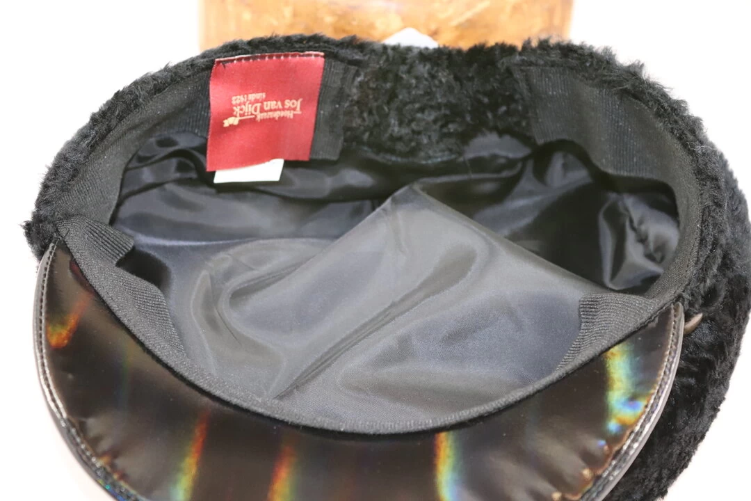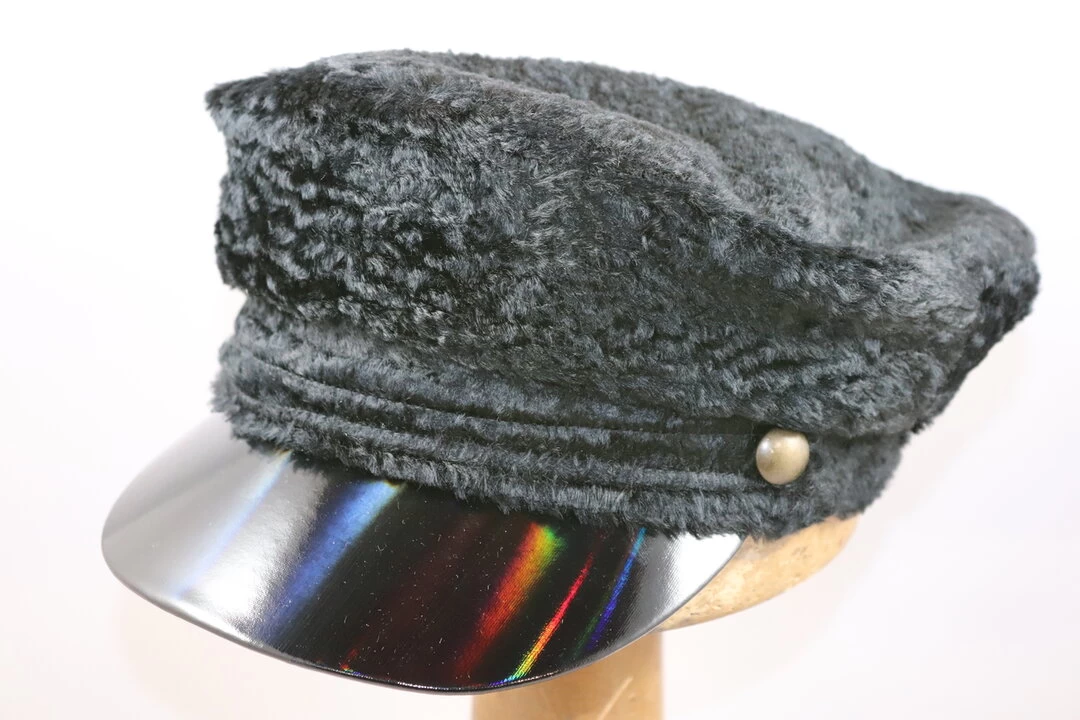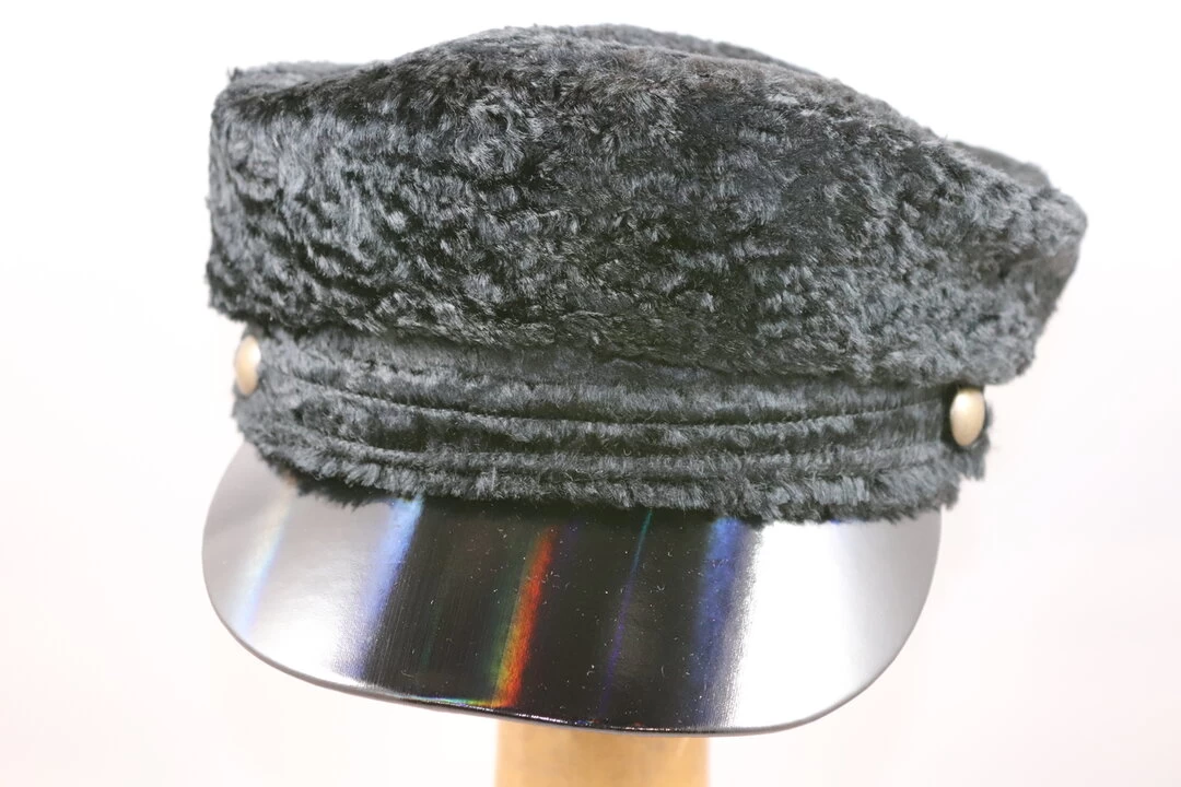 De pet is gemaakt van wol, met een astrakan look afgewerkt met een vinyl klep. De pet is beschikbaar in de maten S/M en M/L.
