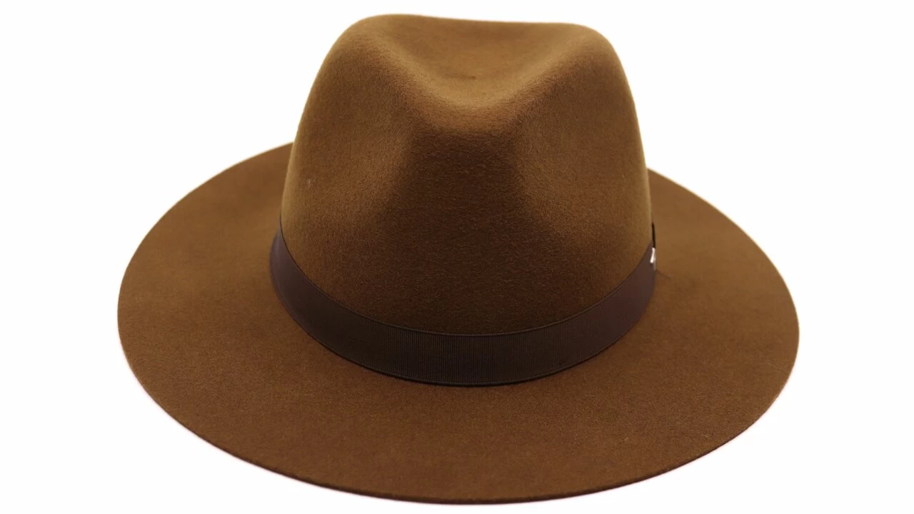 Een elegante fedora met speelse brede rand, gemaakt door Panizza uit Italië (Toscana).