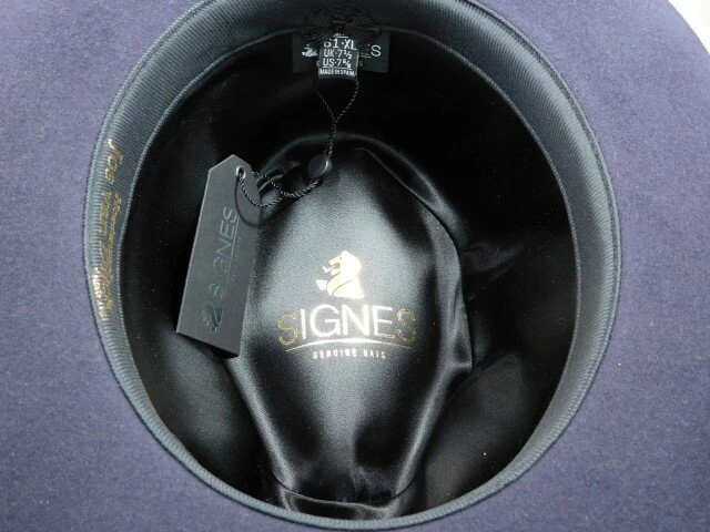 De rand is 7,5 cm breed, strak gesneden en daarna afgewerkt met een zeer fijn zigzag-stiksel, aan de binnenkant een stoffen zweetband en een satijnen voering, wat comfort en kwaliteit biedt.